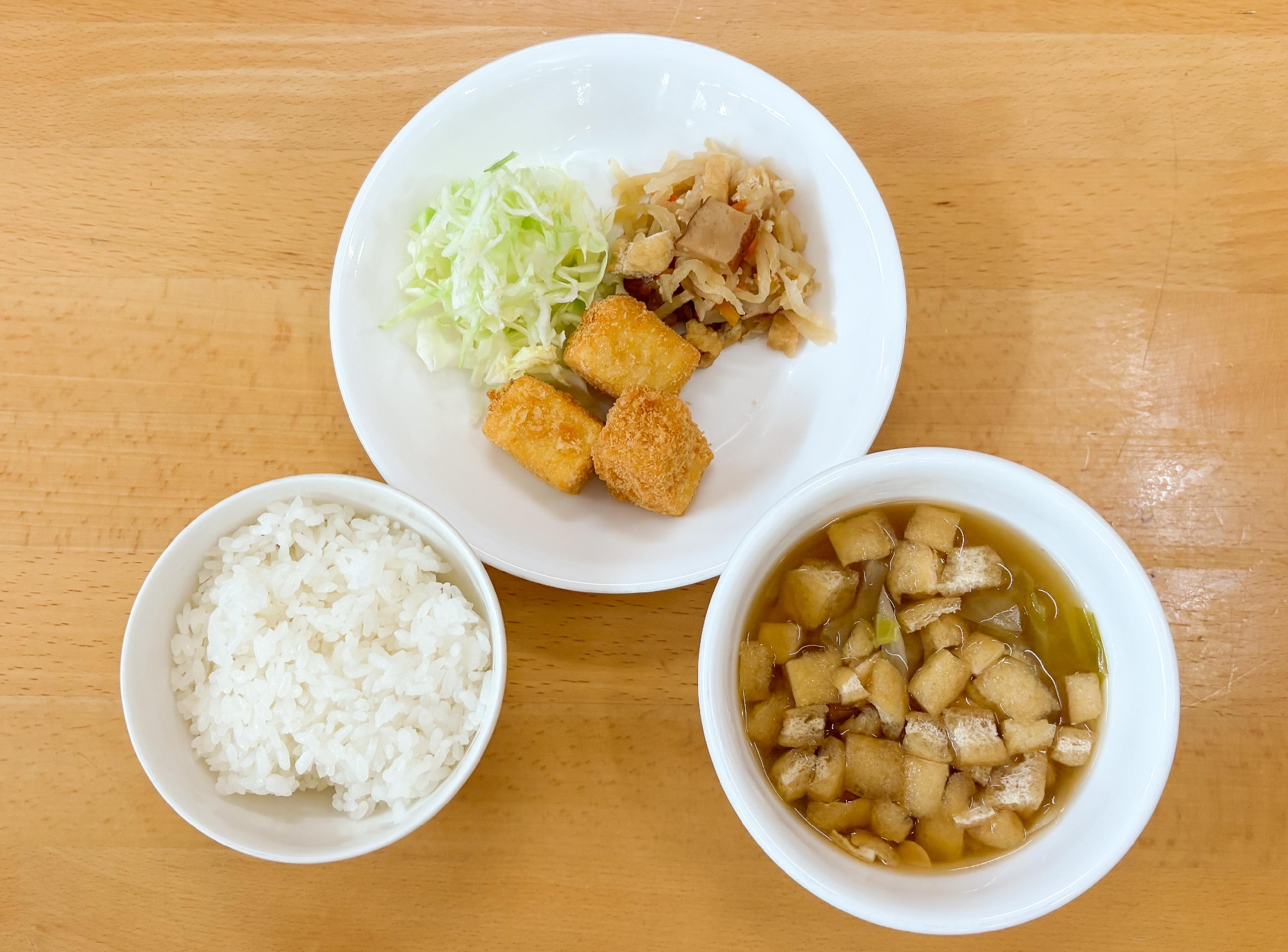 今日は乾物の高野豆腐や切干大根を使ったメニューです。乾物は水分が抜けて凝縮されるため、生の状態と同じ重量で比べると、ビタミンやミネラルなどの栄養分がたくさんUPします。