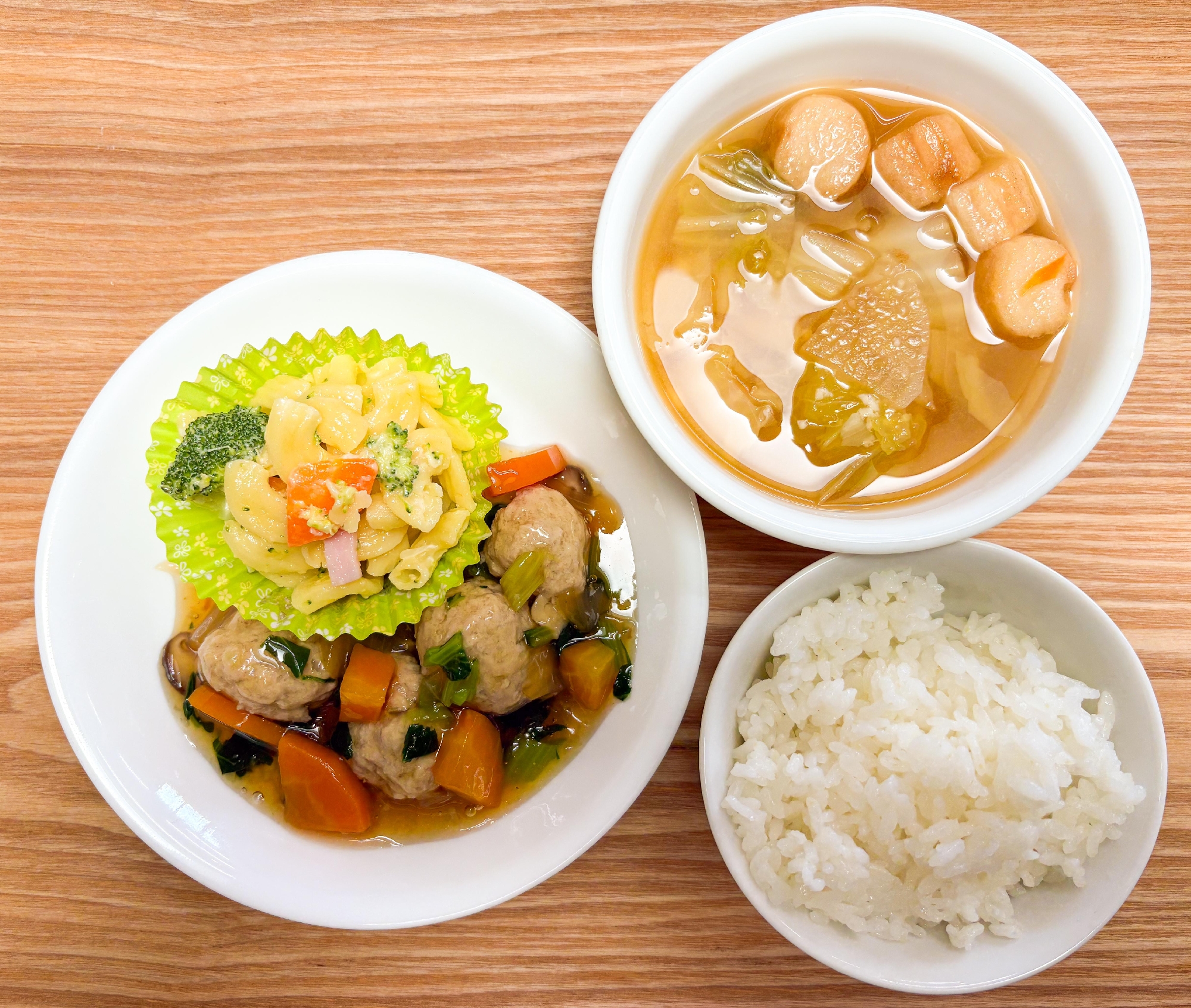 今日はミートボールです。玉ねぎ・しいたけ・人参・小松菜が入ったお醤油ベースの和風の優しい味にできました。みんな完食!明日も元気もりもりです。