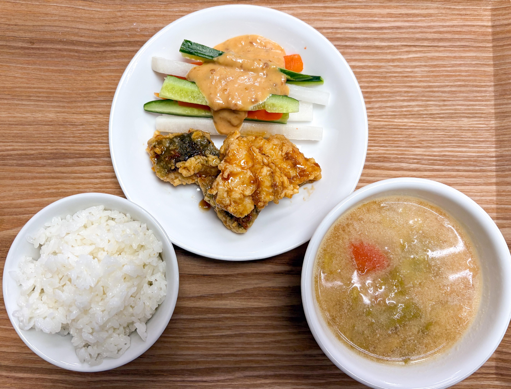 外はカリッと中はふっくらの白身魚のから揚げ。甘辛だれでごはんが進みます。野菜スティックは味噌マヨをつけて前歯でがぶり♪みんな沢山食べました!
